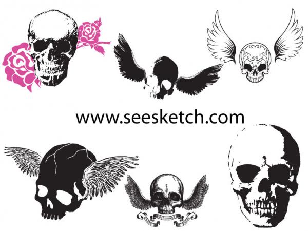 ภาพเวกเตอร์กราฟฟิกหัวกระโหลก แบบต่างๆ มี 6 แบบ ขาวดำ ไฟล์เวกเตอร์ eps ขยายใหญ่ๆโดยไม่เสียรายละเอียดของภาพ เป็นกราฟฟิกสามารถนำไปตกแต่งเพิ่มเติมได้ อาจทำเป็นแบบของลายสัก รอยสัก Tattoo ได้เลย แบบที่ 2 เพิ่มเติม ปีกหัวกระโหลก เป็นกระโหลกประดับปีกนก กราฟฟิกสวยๆครับ