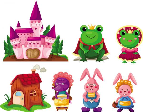 ภาพเวกเตอร์การ์ตูนนิยาย มีกบกับกระต่าย กบเป็นเจ้าชายกับเจ้าหญิง และกระต่างเป็นชาวบ้านธรรมดา มีปราสาทและบ้าน น่ารักครับ ไฟล์เวกเตอร์ Eps