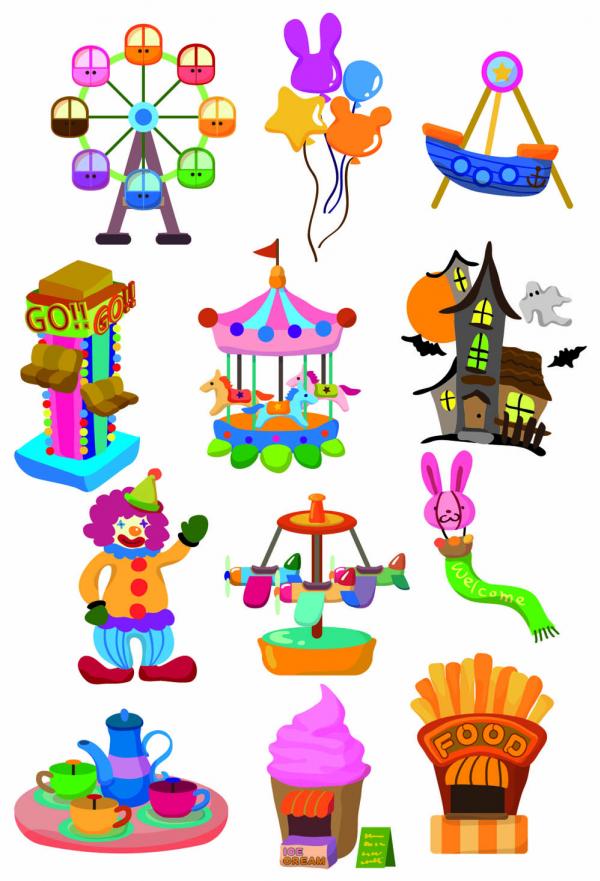 ภาพเวกเตอร์การ์ตูนและเครื่องเล่นสวนสนุก มีตัวตลกและเครื่องเล่นสวนสนุกมากมาย อัดอยู่ในไฟล์นี้ไฟล์เดียว เวกเตอร์น่าเก็บสะสมนะครับสำหรับนักออกแบบกราฟิก ไฟล์เวกเตอร์ eps