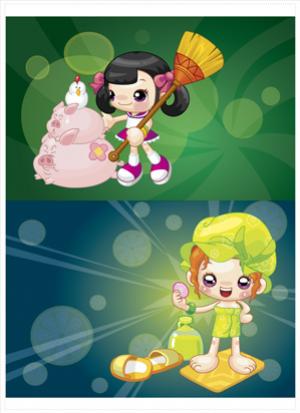 ภาพการ์ตูนเด็กผู้หญิง ถือไม้กวาดมีลูกหมูกับลูกไก่ อีกภาพเป็นการ์ตูนเด็กผู้หญิงนุ่งผ้าขนหนูกำลังจะอาบน้ำ น่ารักดีครับ ไฟล์เวกเตอร์ ai