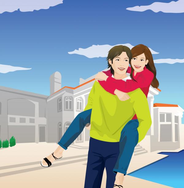 ภาพความสุขของคู่รักชายหญิง ที่เล่นขี่หลังกันหน้าตายิ้มแย้มแจ่มใสทั้งคู่ เป็นภาพที่มีความสุขมากเลยครับ ไฟล์เวกเตอร์ eps สำหรับงานออกแบบกราฟฟิกดีไซน์