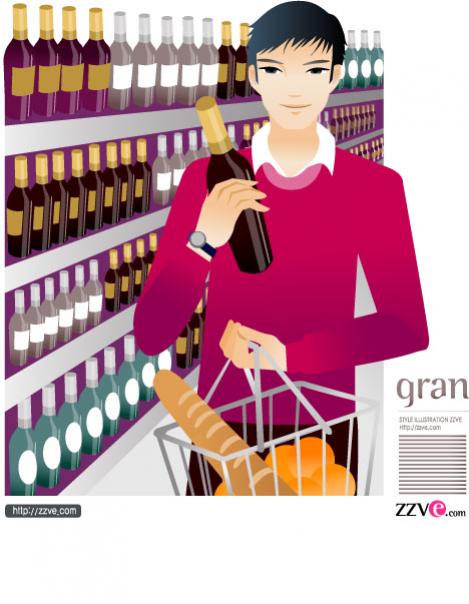 เวกเตอร์ผู้ชายกำลังชอปปิ้งเลือกซื้อไวน์ เพื่อปาร์ตี้อยู่ในห้างซุปเปอร์มาร์เก็ต มีแบ็คกราวเป็นขวดไวน์เรียงกันเต็มไปหมด ในมือของเขาก็ถือขวดไวน์ด้วยและตระกร้าสินค้า ในตระกร้ามีขนมปังและผลไม้อีก ไฟล์เวกเตอร์ ai สำหรับโปรแกรม Adobe Illustrator เท่านั้นนะครับ