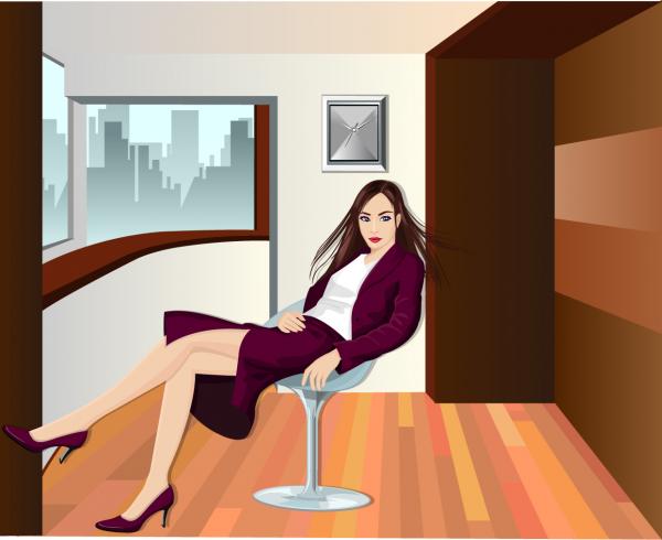 ภาพเวกเตอร์ผู้หญิงนั้งเก้าอี้ทำงาน สบายๆ ท่าทางดูผ่อนคลายดีครับ กับบรรยากาศห้องออฟฟิศสวยๆ หรือจะเรียกว่าห้องทำงานก็ได้นะครับ ตกแต่งด้วยลายไม้สวยๆ ไฟล์เวกเตอร์ AI สำหรับโปรแกรม Adobe Illustrator ครับ