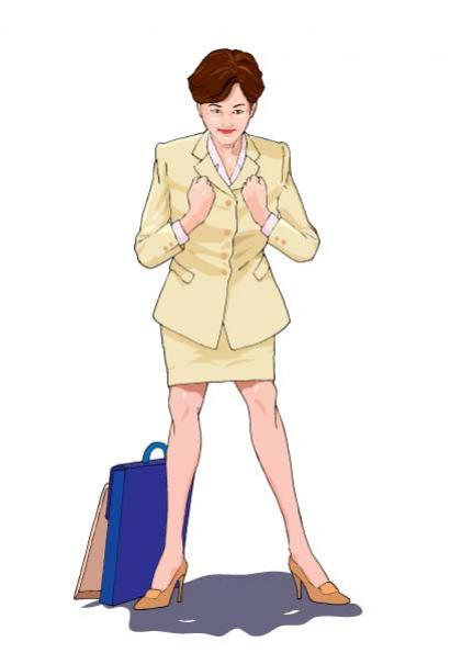 ภาพเวกเตอร์ผู้หญิงใส่ชุดสูทเต็มตัวกระโปรงสั้นสีเหลืองอ่อน มีกระเป๋าทำงานวางอยู่ข้างๆ เป็นไฟล์เวกเตอร์แบบ eps สำหรับโปรแกรมกราฟฟิคทั่วไป