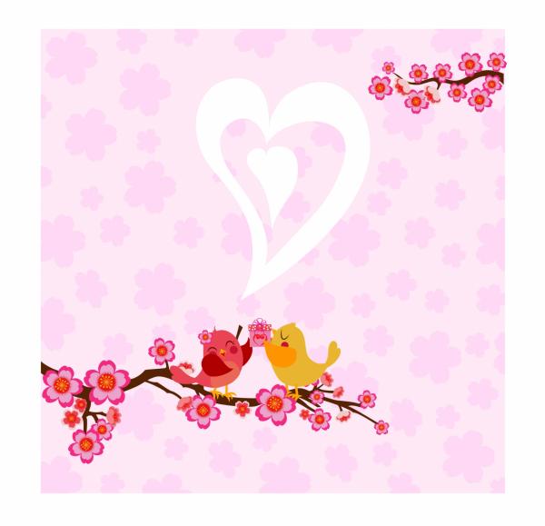 ภาพเวกเตอร์แบ็คกราวเกี่ยวกับความรักคู่รัก เป็นภาพสวยๆที่มีนกสองตัวสื่อถึงคู่รัก และมีดอกไม้ประดับสีชมพูสวยงามมาก มีรูปหัวใจอยู่กลางภาพ ไฟล์เวกเตอร์ eps สำหรับโปรแกรมกราฟิกทั่วไป
